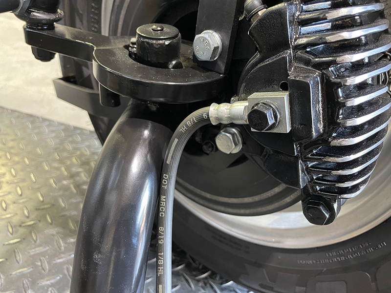 Suspension members go up and down and turn for cornering. It’s therefore a good idea to keep other elements from contacting them. Exhaust systems often suffer from lack of differential clearance. Incorrectly fitted brake hoses can rub on moving and turning parts. Put the suspension and steering through its full travel and check for fouling and rubbing during the set up process.